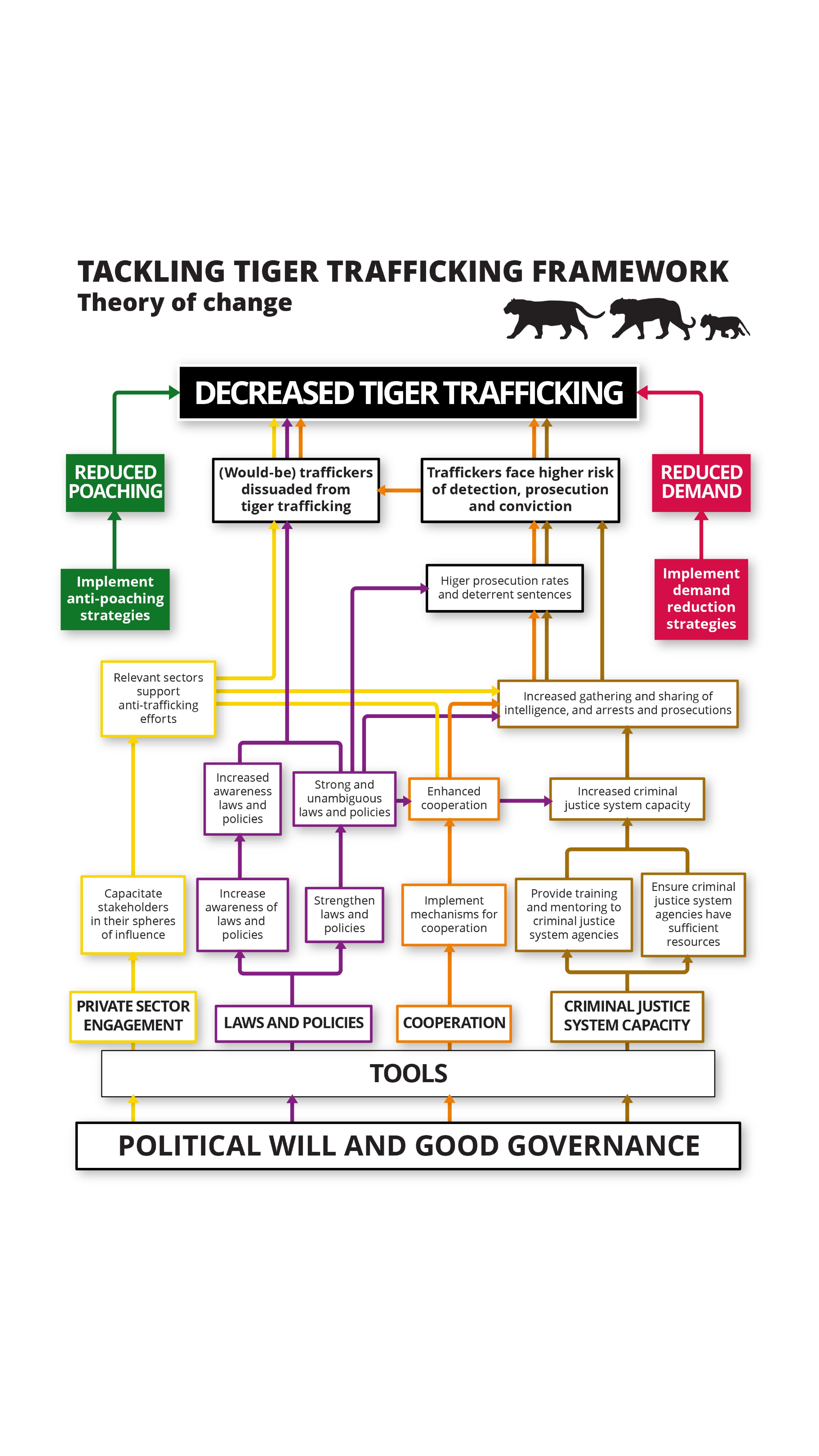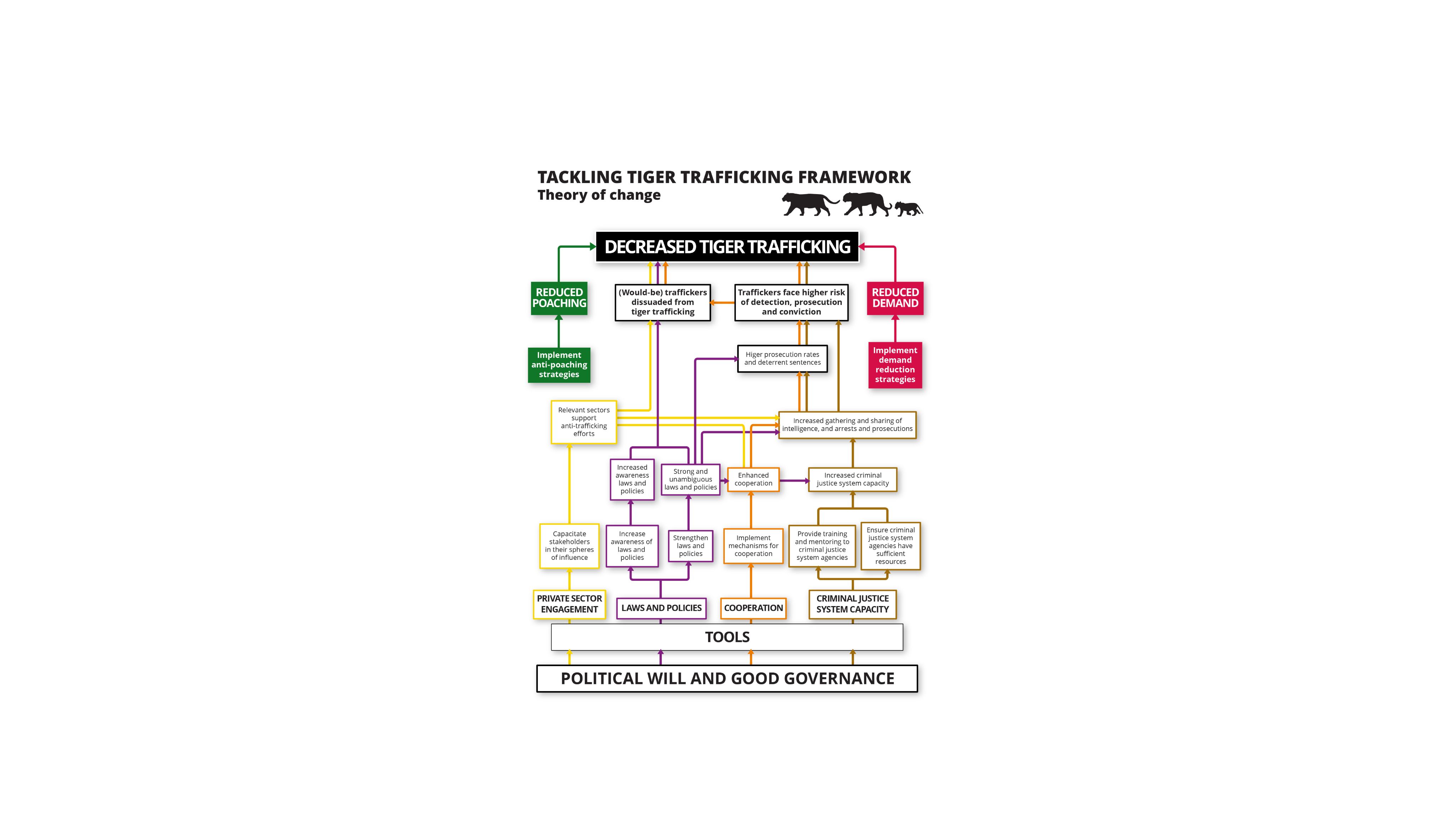 The Tackling Tiger Trafficking Framework, which will help address the illegal trade in tigers and their parts and products, both from wild and captive sources, was launched in November 2022. The technical expertise of more than 12 partners were brought together to develop a key guidance document collating the best strategies, approaches, tools and resources available to break the tiger trade chains. The framework has already been referenced in the Global Tiger Recovery Program 2.0 briefing on combating trade and was launched at a side event at the 19th meeting of the Conference of the Parties to the Convention for International Trade in Endangered Species of Wild Fauna and Flora (CITES CoP19) in November 2022 in Panama.