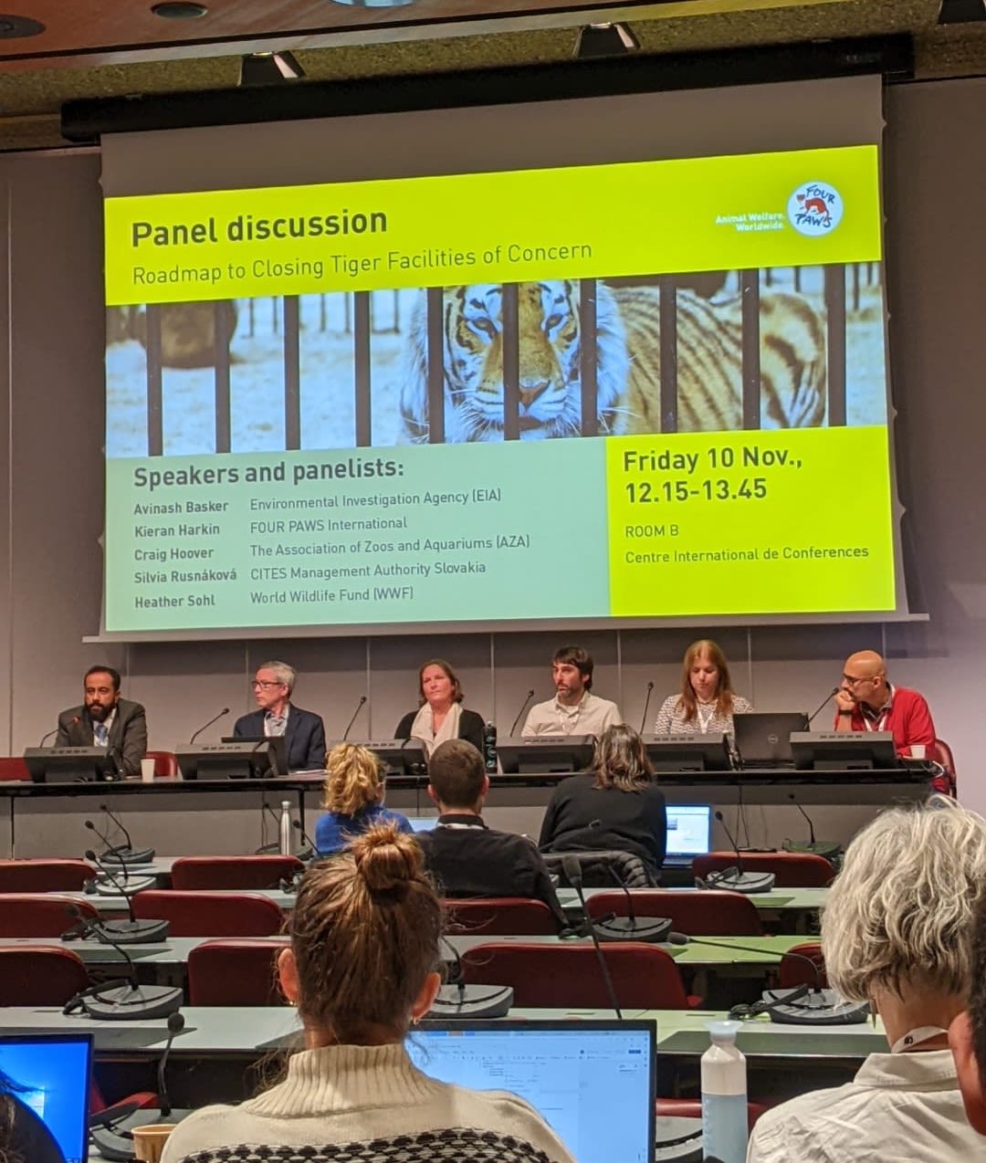 A panel of experts discuss the newly launched Roadmap to Closing Tiger Facilities of Concern at a side event during CITES Standing Committee in November 2023.